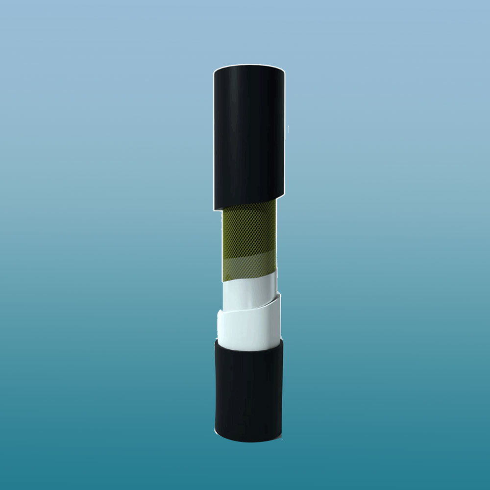 玄武巖纖維纏繞增強(qiáng)聚乙烯復(fù)合(CBF-PE)管 以聚乙烯為基體,以粘接樹脂包覆處理后的玄武巖纖維左右連續(xù)螺旋纏繞成型的網(wǎng)狀
